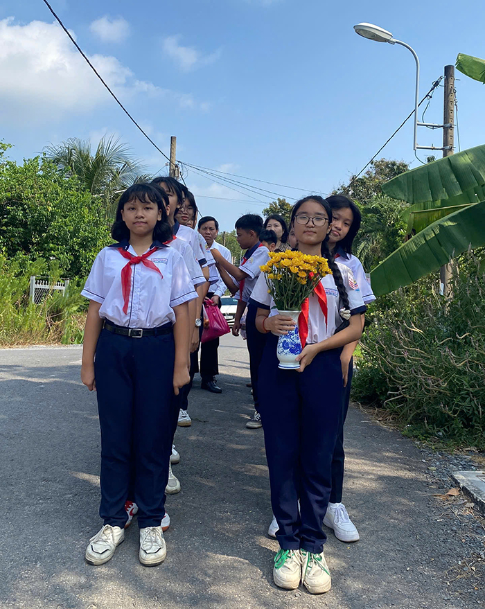 Học sinh dâng hoa trong ngày giỗ